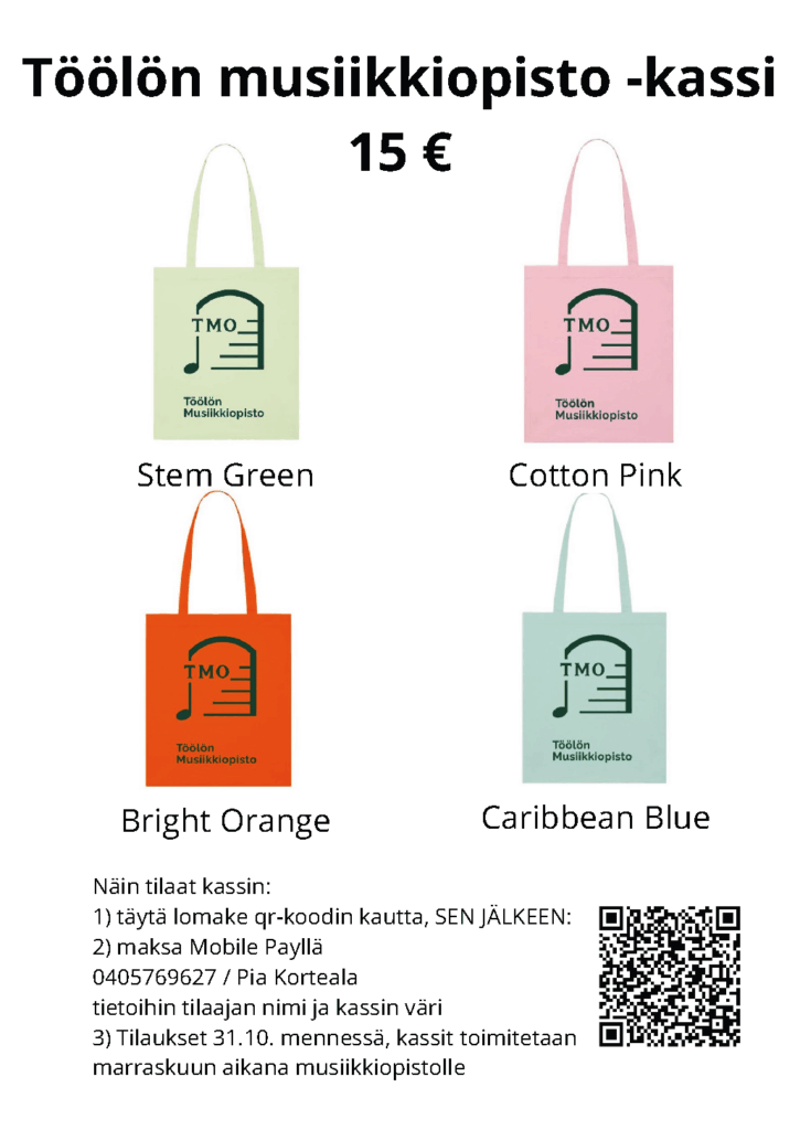Tässä värimallit ja tilausohjeet TMO-kasseihin liittyen: